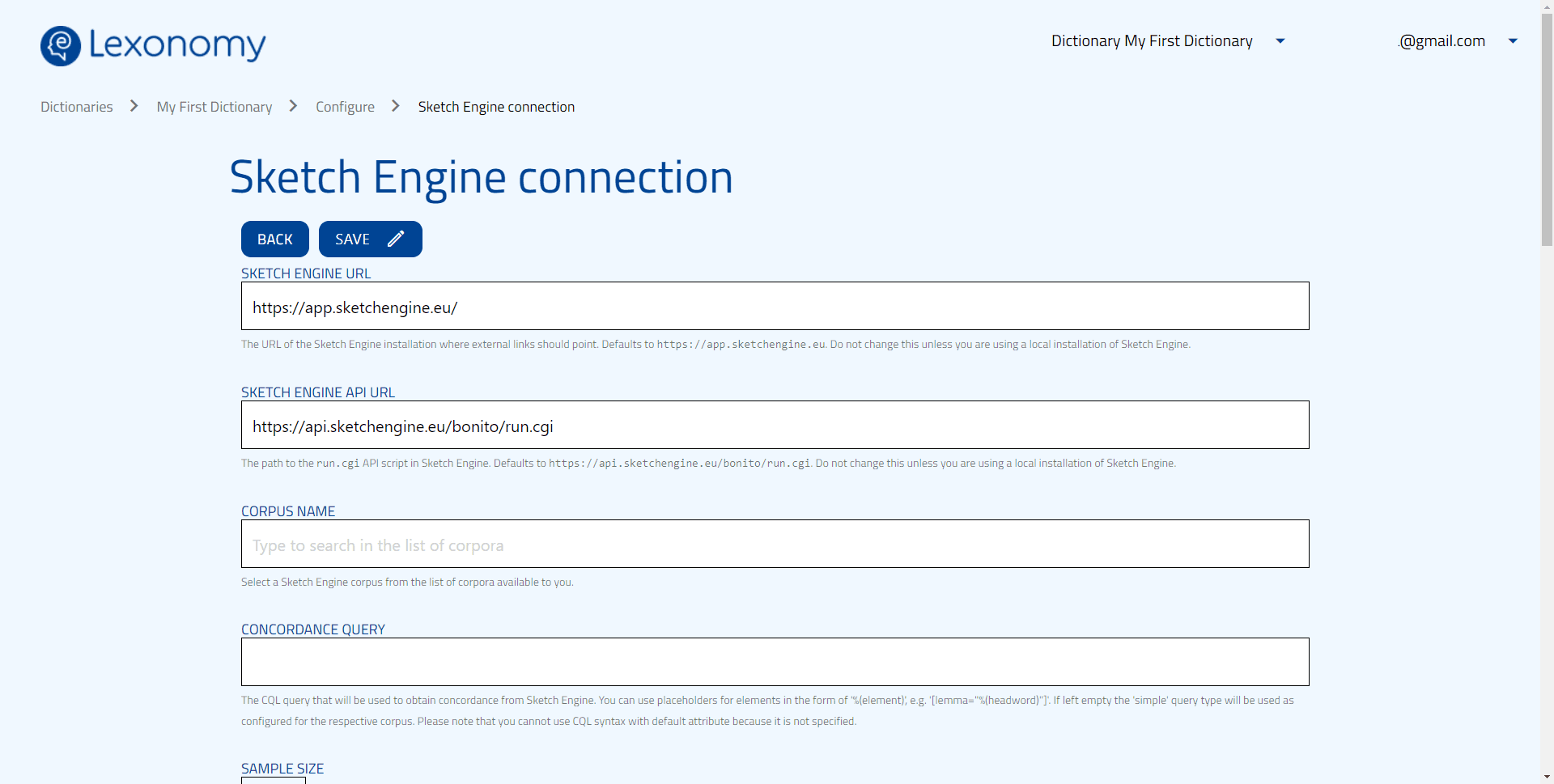 This can be done by configuring your connection with Sketch Engine. This happens in two steps. First, click on your email address in the top right corner, and select Your profile. Here, you will need to link your Lexonomy account to your Sketch Engine account. You will be redirected to the Sketch Engine website. Second, open the Configure menu, and click Sketch Engine . Here, you need to fill in the Sketch Engine URL, Sketch Engine API URL and Corpus name mandatory fields. Note that the Corpus name field will only be available once you have completed step one and linked your Sketch Engine account to your Lexonomy profile.